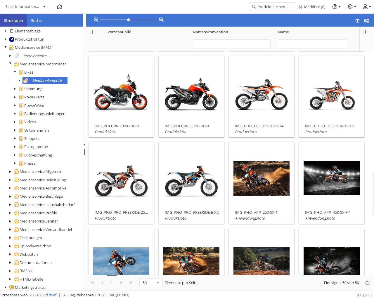 Zusätzlich zu den produktbezogenen Inhalten können im PIM auch allgemeine Marketinginhalte wie Logos, Präsentationen, Imagebroschüren und unternehmensbezogene Bilder und Broschüren recherchiert werden. Hierfür steht im crossbase-MAM eine allgemeine Medienstruktur zur Verfügung, auf die auch im Sales Information Service zugegriffen werden kann. Analog dazu kann auch in Ausgabestrukturen gesucht werden. Dies kann zum Beispiel eine Struktur sein, die für den Online-Shop oder den Printkatalog verwendet wird. Typische Anwendungsfälle sind, dass ein Bild aus dem Online-Shop in hoher Qualität für eine Broschüre benötigt wird oder dass ein Bild aus dem Printkatalog in digitaler Form verwendet werden soll.